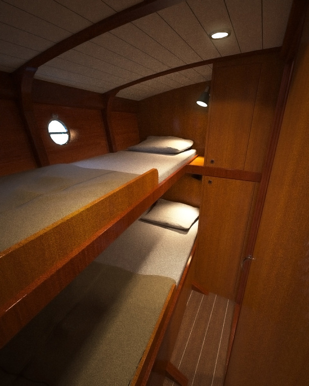 The arrangement of the P39, starting from the bow; furthest forward is a large storage locker for anchor chain and deck gear. Next aft is the full-width owner’s cabin with double berth on centerline and lockers port and starboard. Overhead is a opening skylight and there are opening portlights. The passage aft from the owner’s cabin to the deckhouse has sliding doors port and starboard. On the port side is a single roomy head with separate shower stall. On the starboard side is a guest sleeping cabin with upper and lower berths as well as hanging locker and storage drawers. Both the head and the guest cabin have opening portlights for ventilation and light. Three steps up bring us to the deckhouse living area with windows all around. The forward end of the deckhouse is the helm and navigation center of the ship. There are raised seats here for helmsperson and navigator. Also there is a large desk at the nav. station forward. The in-line galley is aft on the starboard side, and opposite is the dining area which converts to a double berth.